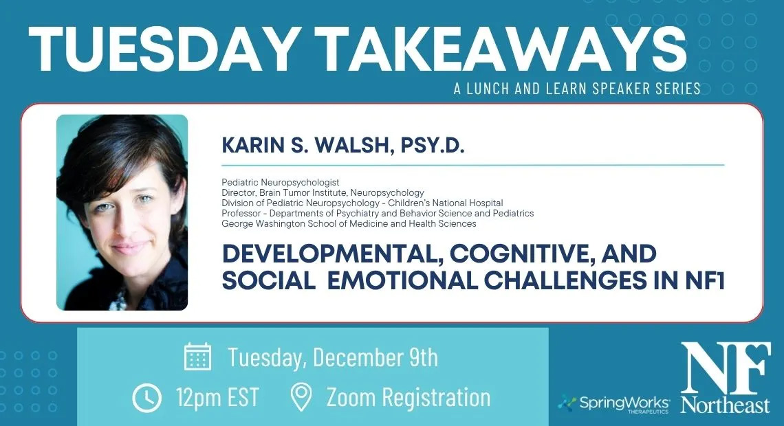 Are you a parent or caregiver of a child living with NF? Please join us for an engaging discussion with Dr. Karin Walsh, who will discuss developmental, cognitive, and social-emotional challenges in NF1, from childhood to young adulthood. She will share resources for families to seek professional guidance in navigating these challenges.