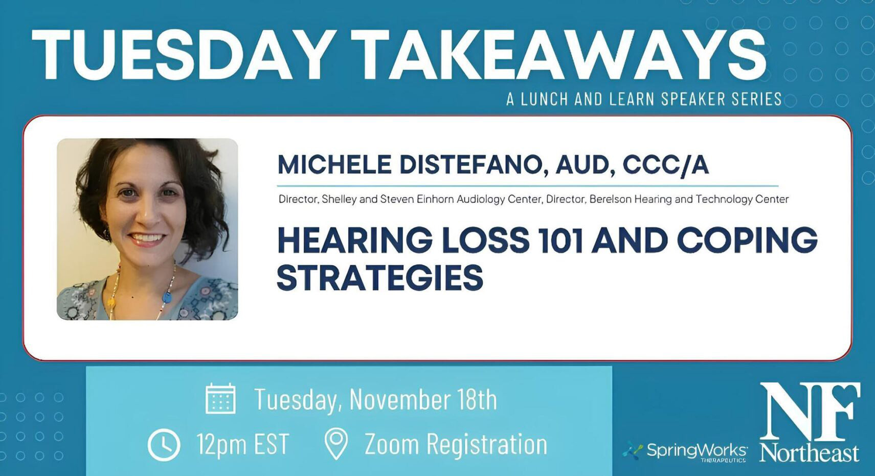 Hearing Loss 101 and Coping Strategies: Are you or a loved one experiencing hearing loss? Hearing health is incredibly important and can affect people living with neurofibromatosis, schwannomatosis, and the general population in different ways. Dr. Michele DiStefano, an expert in audiology from the Center for Hearing and Communication, will be talking about the signs and symptoms of hearing loss and effective coping strategies.