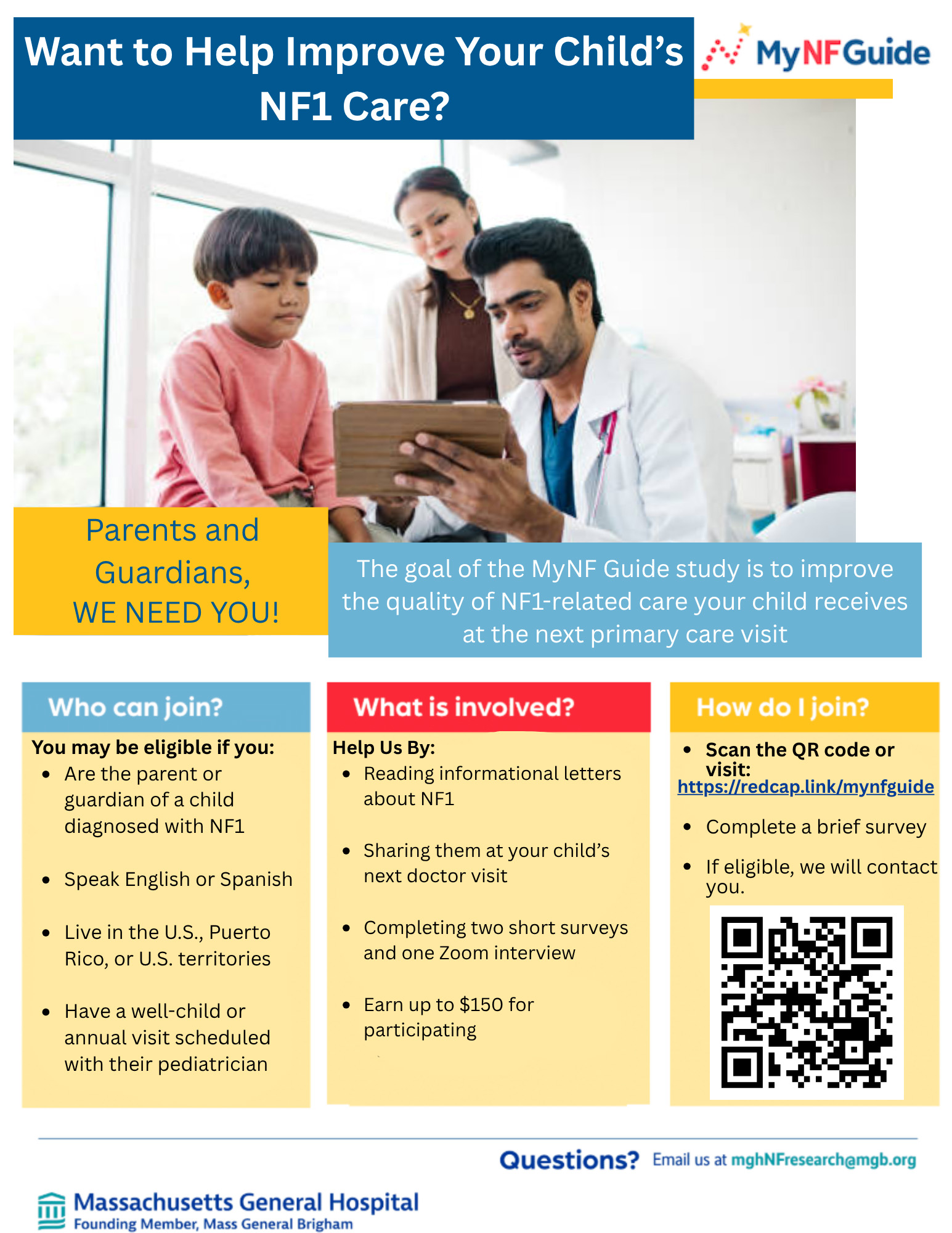 One such trial is happening at Mass General. They are close to completing enrollment for adults with NF1, but are still in need of parents of children with NF1, especially those who do not attend NF1 specialty clinics.